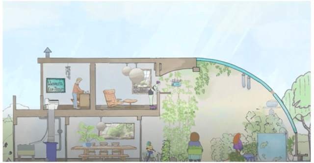 - Nutrient recovery and recycling is enabled by eco-toilets and composting centers.
