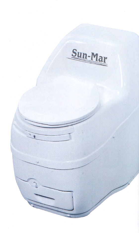 The self-contained Sun-Mar system consists of a waterless, small-bin toilet that contains a composting “bio-drum” that the user periodically turns by hand. A fan moves air through the bio-drum and through the evaporation chamber.