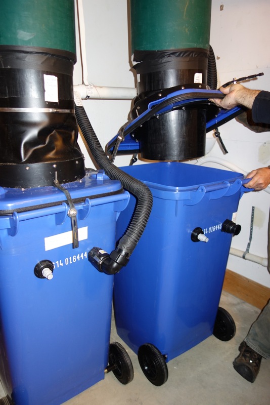 To see if bin is full, the homeowner can either open the lid and look, or install an optional electronic warning sensor. When a bin becomes full it is disconnected from the chute, (Fig.1) and a new empty bin is put in its place, (Fig. 2).